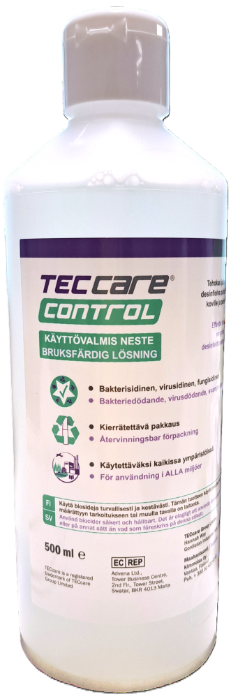 TECcare® CONTROL desinfiointiaine on eittäin tehokas ratkaisu puhdistukseen ja desinfiointiin bakteereja, viruksia, sieniä, itiöitä ja mykobakteereja vastaan. Käyttövalmis tuote ei sisällä klooria eikä alkoholia, eikä se ärsytä ihoa eikä limakalvoja. Ei varoaikaa. Sopii kaikille pinnoille. Tarkoitukseen kehitetyn teknologian ansiosta tuotteen kemikaalipitoisuudet ovat erittäin alhaiset ja desinfiointitulokset tutkitusti erittäin korkealaatuiset.